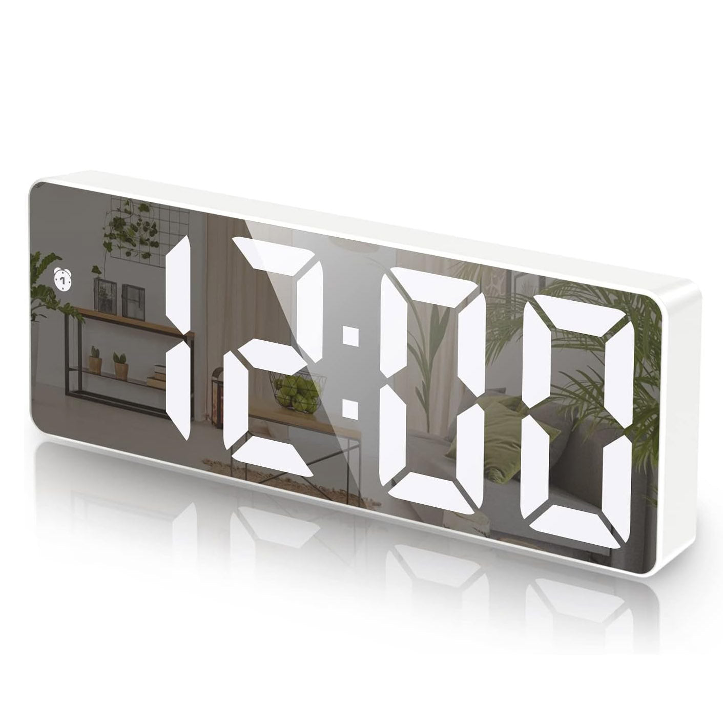 Este reloj despertador digital cuenta con una gran pantalla LED de fácil lectura (6.3 x 0.7 ~ 1 x 2.36 pulgadas), que permite ver la hora con claridad incluso a distancia. Su diseño moderno y funcional incluye cinco modos: reloj, fecha, temperatura, modo nocturno (ON/OFF) y alarma. Los botones traseros están claramente identificados, lo que facilita mucho su configuración. Además, el indicador luminoso “:” parpadea constantemente para mostrar el paso del tiempo.