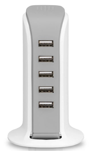 Descripción No más esperas en la cola. Con nuestra conveniente estación de carga, puede cargar todos sus dispositivos simultáneamente en muy poco tiempo. Su teléfono, el teléfono de su esposa, la tableta del niño, su altavoz portátil y auriculares están conectados y listos para comenzar el viaje.Especificaciones5 puertos USB 2.0 para hasta 6A.Voltaje de entrada: 110 / 220V 50 / 60Hz.Voltaje de salida: 5V.Protección contra sobrecarga y cortocircuito.Cable de alimentación de 5 pies incluido.Dimensiones (in): 1.70 x 0.92 x 0.61.