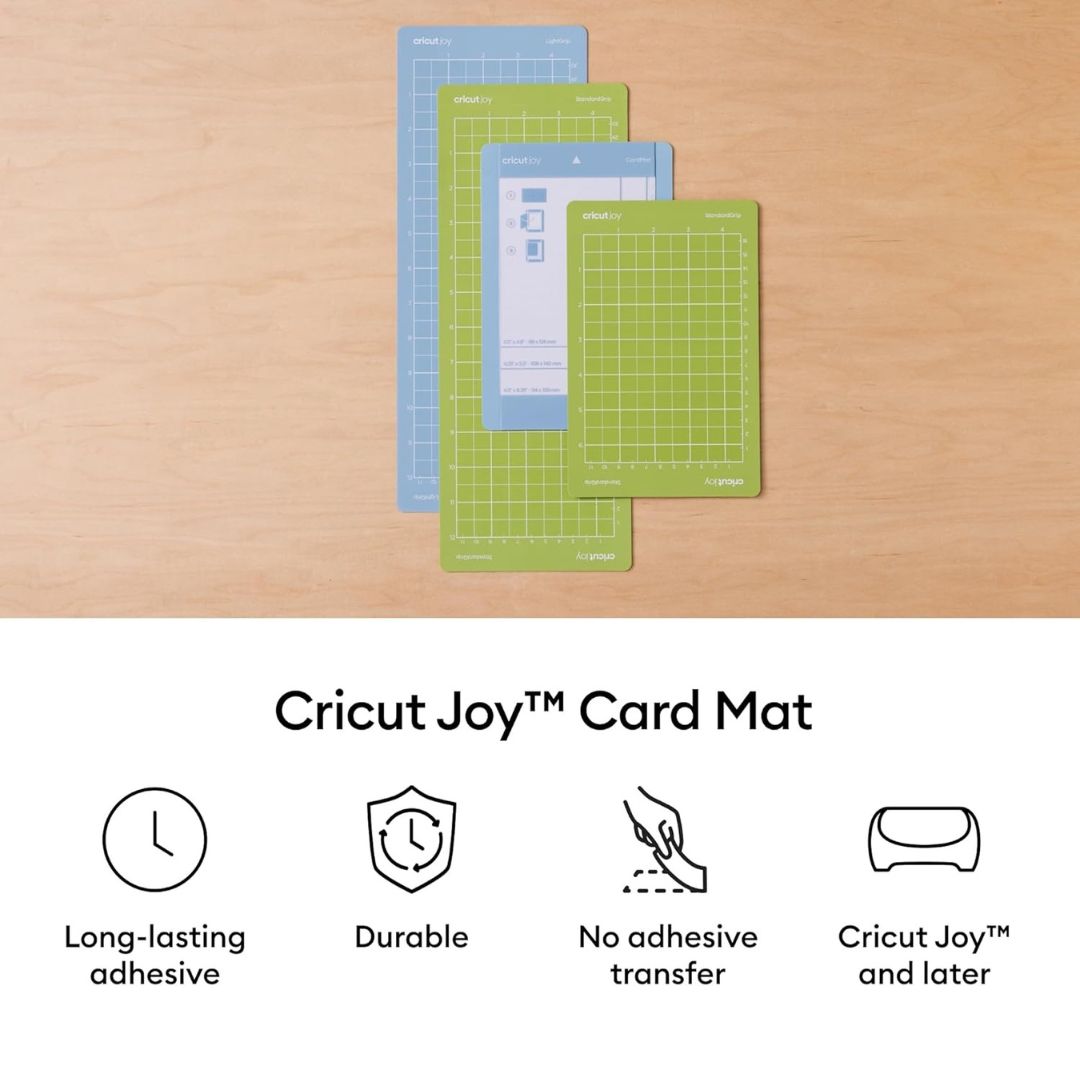 Juego de 3 alfombrillas de 4.5 x 6.25 pulgadas (11.4 x 15.9 cm) diseñadas para corte de tarjetas en Cricut Joy. Incorporan adhesivo de larga duración para mantener el material firme sin dejar residuos.