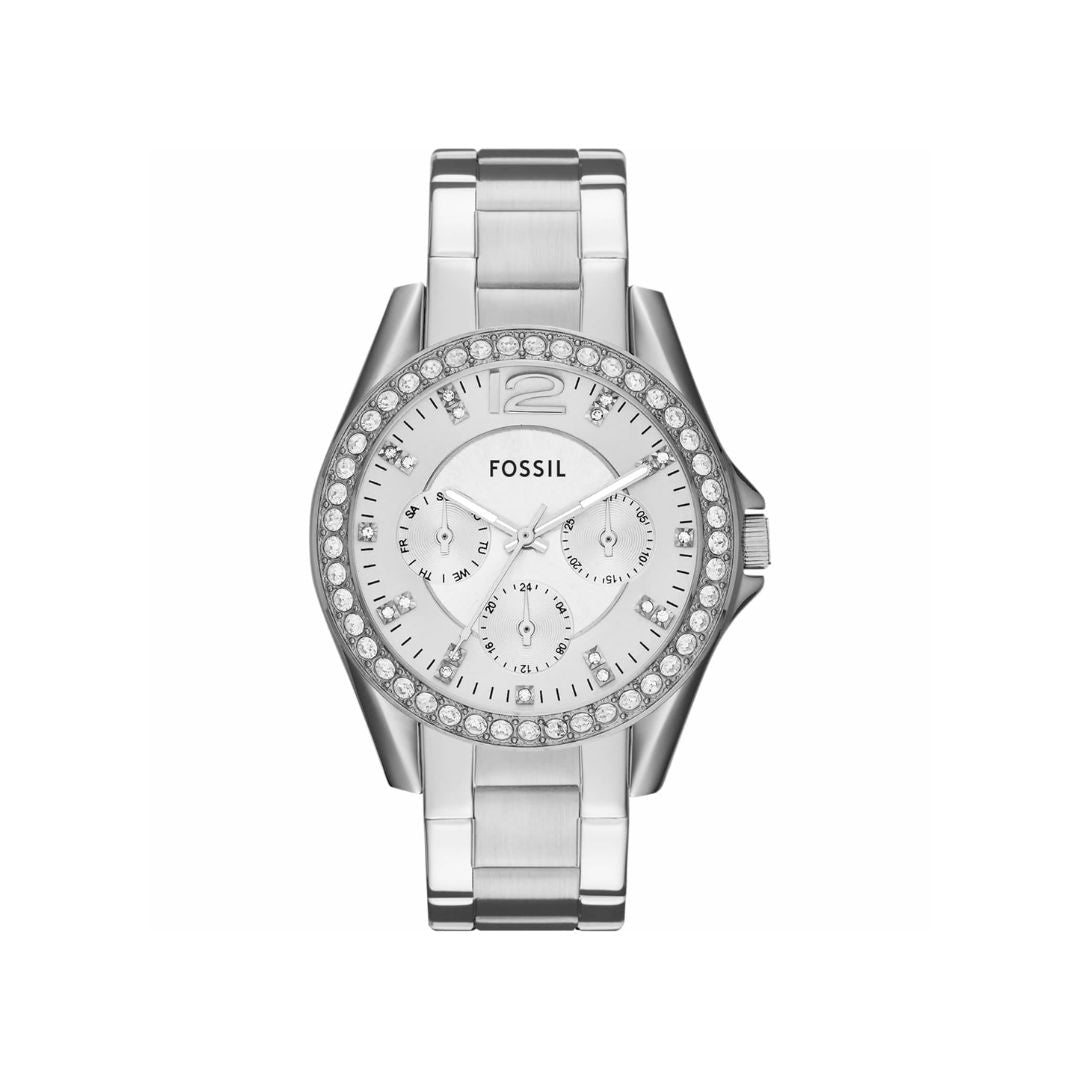 Este reluciente reloj modelo Riley añade brillo a cualquier atuendo que uses, funcional para cualquier temporada del año. El acero inoxidable brillante y la esfera de cristal deslumbrante garantizarán que destaques con este bello accesorio. Este reloj Riley también cuenta con un movimiento multifunción con una pulsera de acero inoxidable.