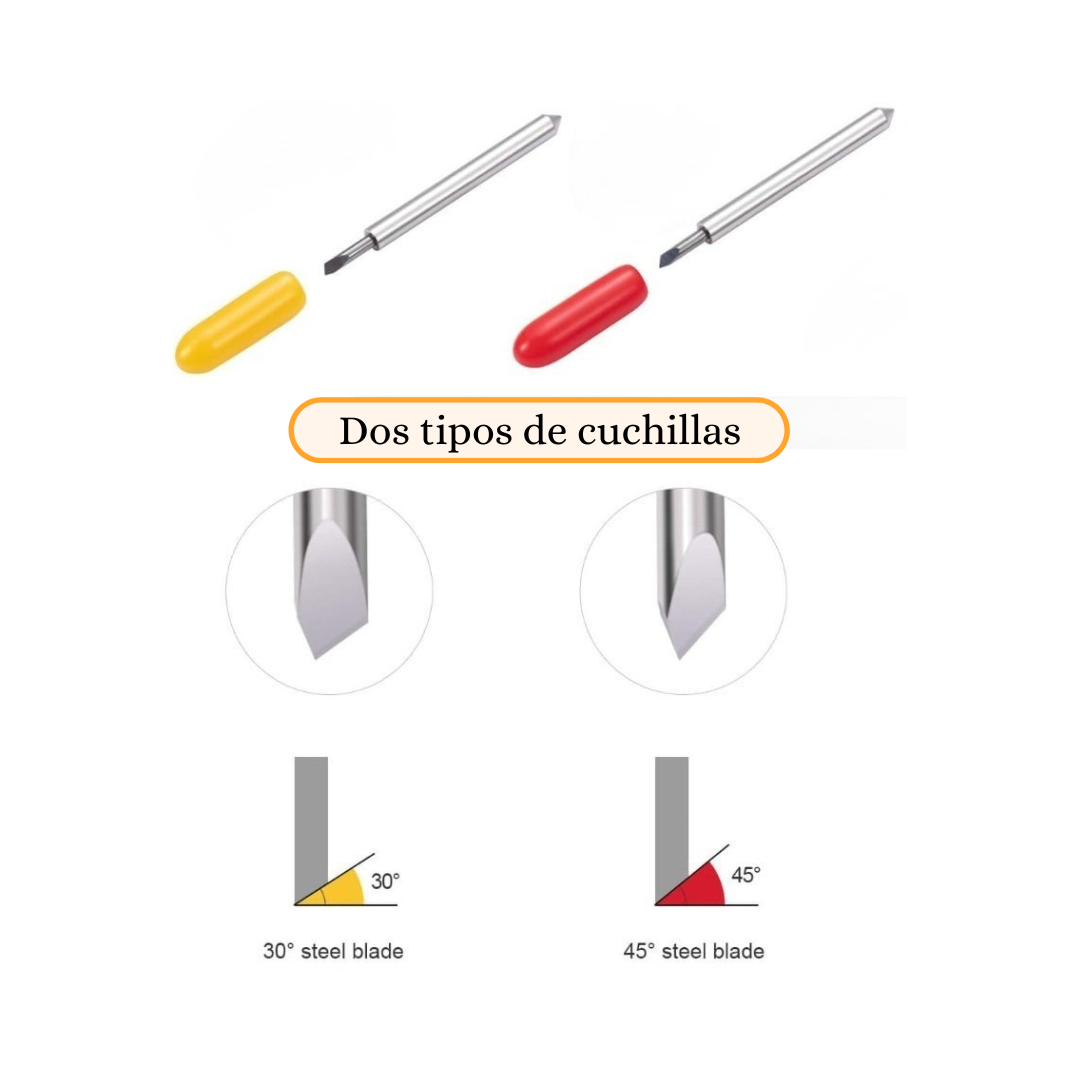 Ideales para diferentes materiales, 30° cuchilla de punta fina para materiales finos: papel washi, papel de arroz, película de acetato; la hoja estándar de 45° es la cuchilla de corte universal, como vinilo, calcomanías, tableros de póster, cartulina laminada, cartón, tarjeta, etiquetas y papel de computadora, etc.