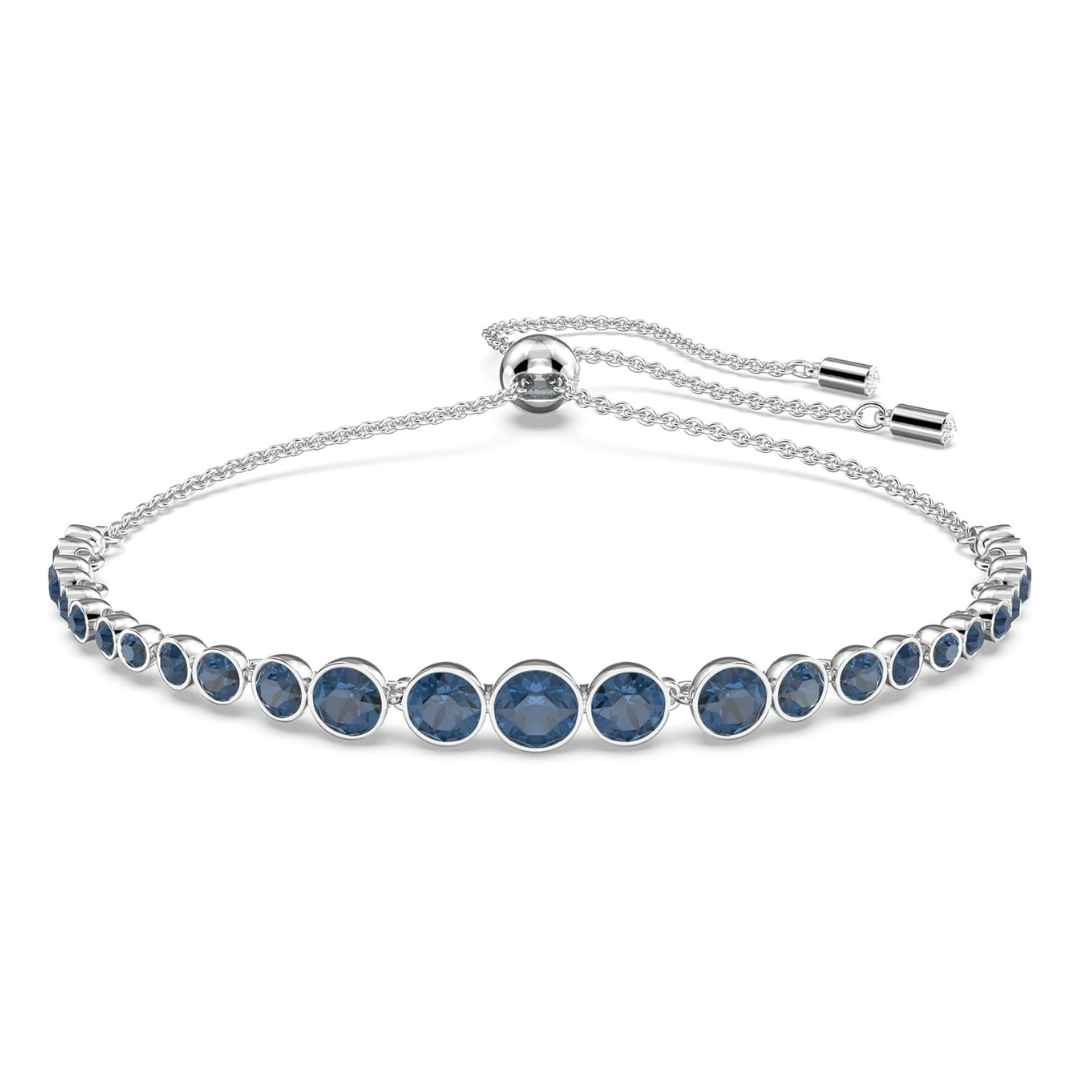 Brillante: toda la delicada cadena con acabado en rodio está adornada con cristales color azul, circulares y terminada con un cierre de bolo ajustable