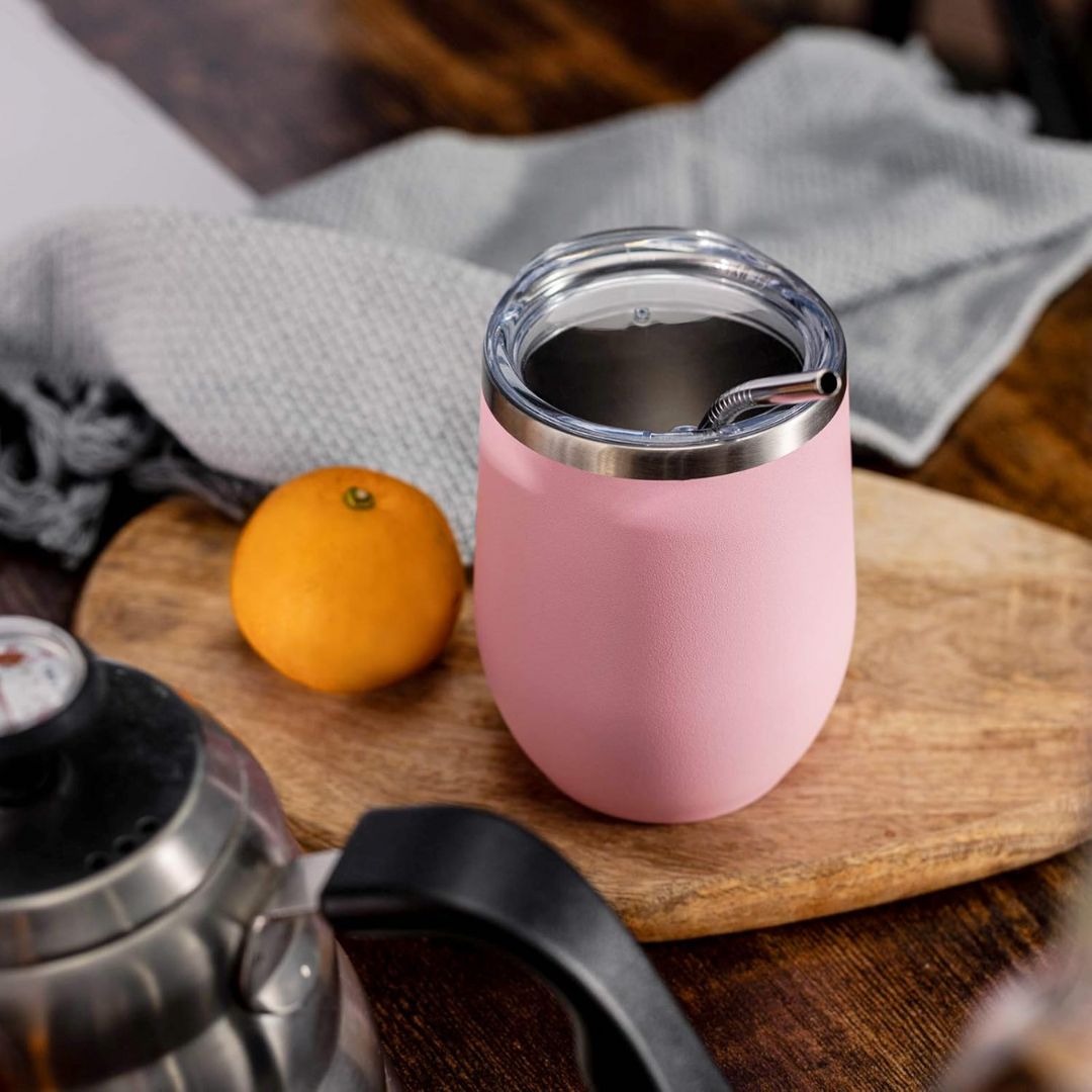 Vaso para vino de acero inoxidable con tapa, de 12 onzas para café, vino, cócteles, helado, con tapa y pajilla. (Color Rosa)